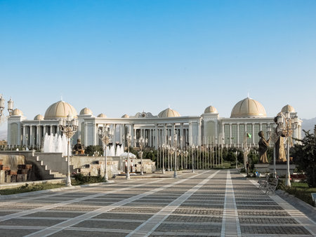 Asjchabad, Turkmenistan - June 1, 2019: The white and marble city of Asjchabad with great buildings and landmarks and parks in Turkmenistan.