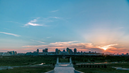 Panorama with sunset of the Astana city timelapse and the presidents residence Akorda with park