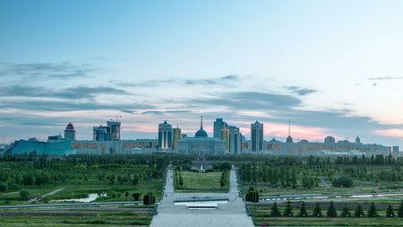 Panorama of the Astana city day to night timelapse and the presidents residence Akorda with park