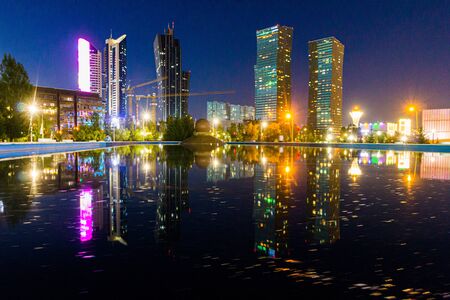 Evening view of reflecting skyscrapers in Astana (now Nur-Sultan), capital of Kazakhstan.