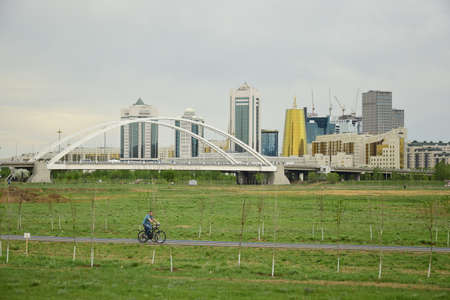 May,3,2020 - Nursultan, Kazakhstan: Bridge across river in city centre. Blurred Nursultan view