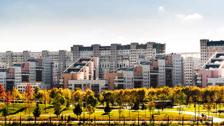 Moscow, Russia - October 9, 2021: Futuristic looking residential buildings viewed from the park Khodynka field. High quality photo