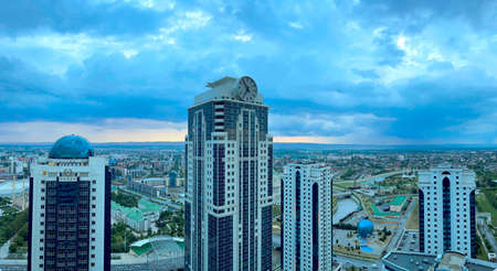 23 of July 2021 - Grozny, Chechen Republic, Russia: The skyscrapers of the Grozny City, earial view