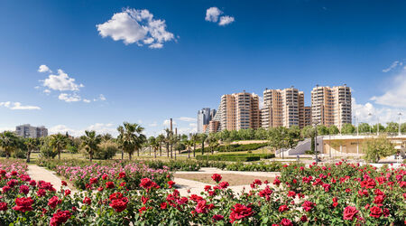 Modern apartments in the city of Valencia, Parque Jardin del Turia and flowers in the foreground.