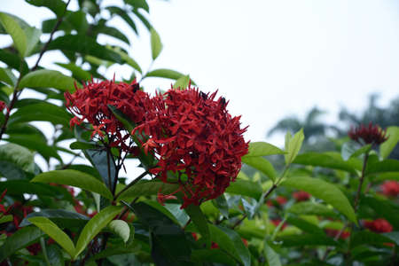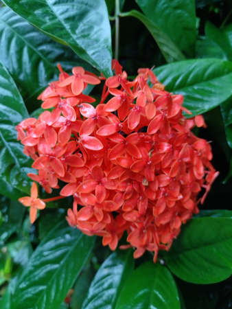 Close-up of Chinese ixora in the garden with green leaves. Flower and plant.