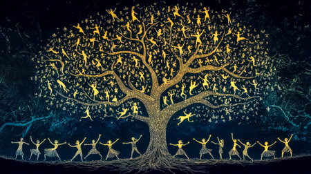 Golden stylized human figures dancing around and on a large tree celebrating nature and life
