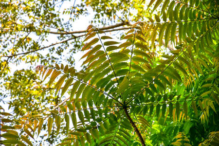 trees in the park with autumn leaves and grass and sunlight, fresh green nature background at out door in city for relax area good breath healthy. green environment garden ozone oxygen save world.