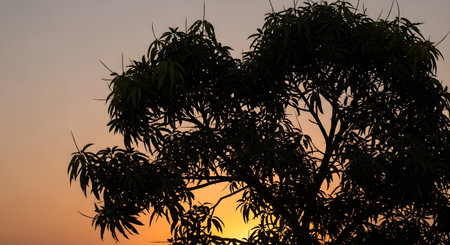 The silhouette of a lush mango tree against a warm, gradient sunset sky. The sun is setting behind the leaves, casting a beautiful orange and yellow glow. The image evokes a sense of peace, tranquility, and the beauty of nature at dusk.
