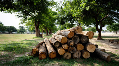 A serene view of stacked logs resting on a grassy area, surrounded by vibrant trees, offering a calm and picturesque outdoor setting ideal for nature lovers.
