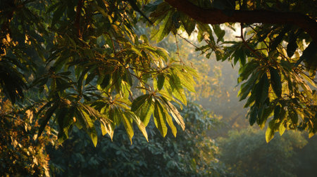 The Breadnut tree at dawn soft golden sunlight kissing leaves clean air natural color