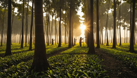 Silhouette of woman standing in tea plantation with morning sunlight. ai generated.“This image was created using generative artificial intelligence tools