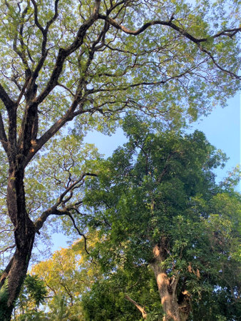 An upward perspective captures a large tree with dense, green leaves reaching towards the sky. The image showcases a textured tree trunk and branches that fill the frame. This natural composition, with overhead lighting, provides a visually appealing look suitable for various commercial or editorial applications.