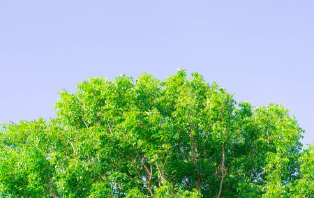 Fresh green tree over blue sky background, abstract natural wallpaper, bright sunny day, freshness of spring nature, life concept..