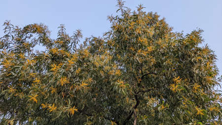 Earleaf Acacia tree with yellow flowers at dusk in Delhi
