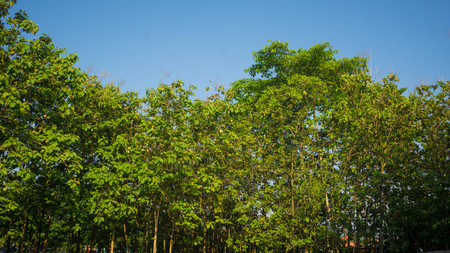 Top of trees with lush foliage set against a clear blue sky, creating a peaceful and scenic nature view