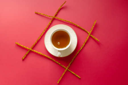 White cup tea on red background, christmas yellow tinsel, flat lay