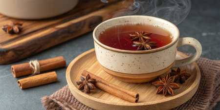 AI Generated. Cozy winter drink with steaming hot tea and cinnamon sticks
