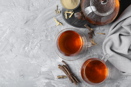 Aromatic licorice tea, dried sticks of licorice root and powder on light gray textured table, flat lay. Space for text