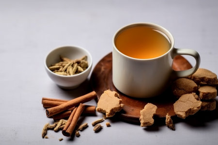 A warm herbal infusion in a ceramic cup, featuring cardamom pods and root herbs. set against a light background, this tea embodies soothing and natural flavors.