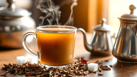 Glass cup of hot tea emitting steam, placed on an elegant marble and wood tray, bathed in the warm glow of morning sunlight