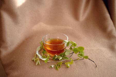 Cup of tea, herabal natural tea. Morning warm tea with eucalyptus