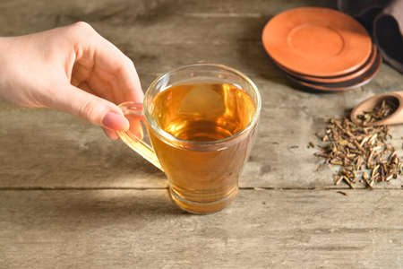Woman holding cup of tasty hojicha green tea on wooden background, closeup