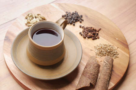 A cup of tea with spices on a wooden board copy space on a wooden background.