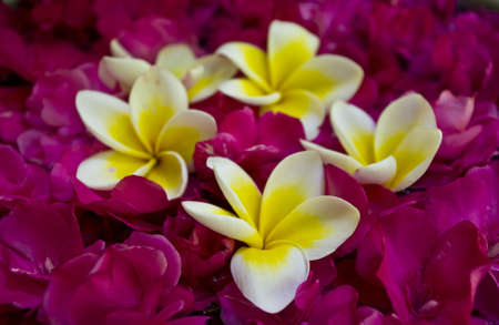 group of yellow white and pink flowers (Frangipani, Plumeria) on a sunny day with natural background in THAILAND