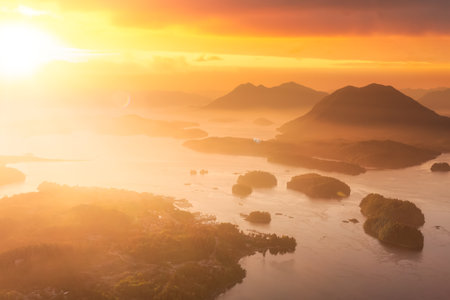 Tofino, Vancouver Island, British Columbia, Canada. Colorful Sunset Sky Art Render. Aerial view from an airplane in the summer.
