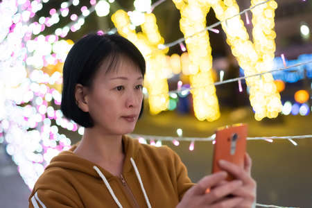 traveling mature Asian woman using mobile phone at Sun Moon Lake, Taiwan