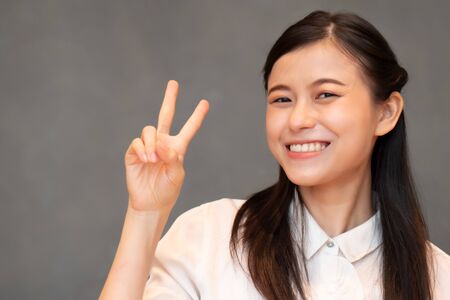 Confident young Asian woman smiling while showing a peace sign with one hand and winking slightly, expressing playful and cheerful emotion in a studio portrait on gray background.