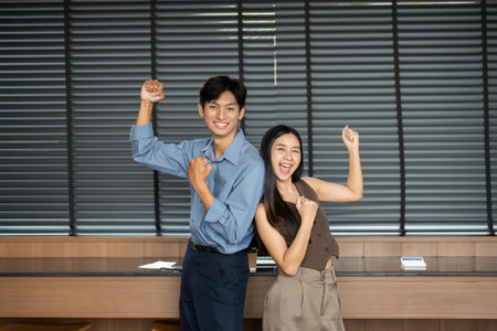 Business Achievement and Joy. Colleagues posing triumphantly in a modern office environment.
