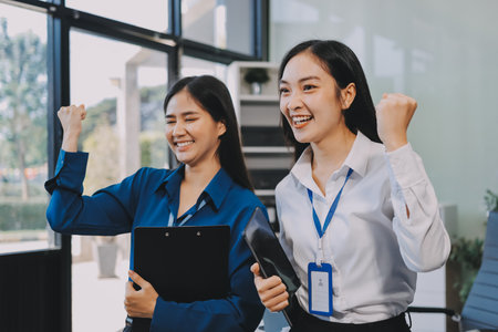Happy excited two Asian women friends celebrate success or achievement in meeting room with laptop