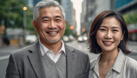 Portrait of a couple - Asian man and woman, elderly, gray-haired, smiling happy against the background of a city street, modern high-rise buildings.