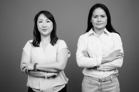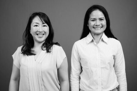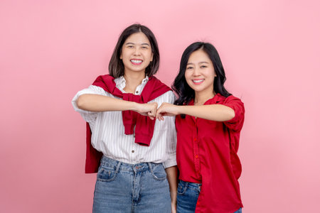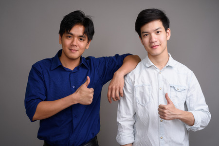 Two smiling Asian men stand side by side, exuding friendship and warmth against a soft gray background. Their casual attire and relaxed poses highlight a strong bond, capturing the essence of camaraderie and youthful energy.
