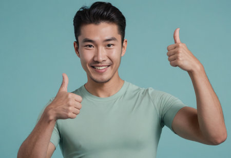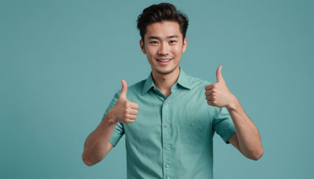 A happy man in a light green shirt gives two thumbs up, his face radiating joy and satisfaction.