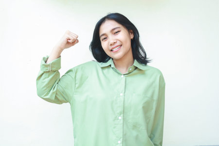 proud asian woman wearing green casual oversized shirt raising arms show strong bicep looking at camera with confident smile standing over isolated background
