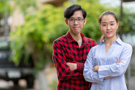 Portrait of handsome Young Asian Thai man in early 20s against white background