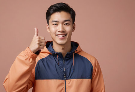 A smiling young man in a casual orange and blue jacket giving a thumbs up, suggesting a relaxed and happy demeanor.