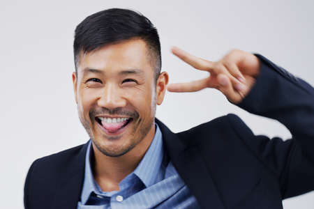 Time to have some fun. Studio shot of a handsome businessman feeling cheerful and dancing against a grey background.