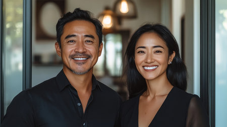 Happy couple stands closely in a bright, contemporary living space, radiating warmth and joy.