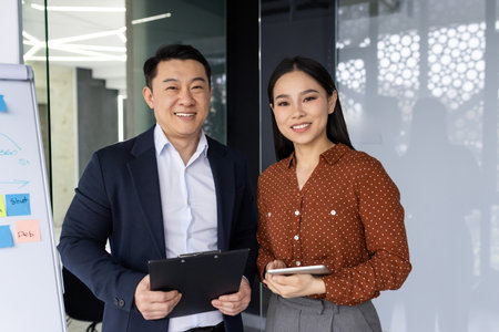 Asian workers standing together in modern office setting, showcasing teamwork and professionalism. Man holding clipboard, woman using phone for presentation, conveying business collaboration