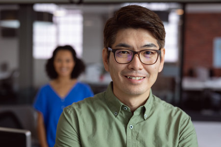 Portrait of smiling asian businessman standing in office with female colleague in background. working in business at a modern office.