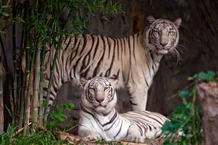 White tiger on a black background with bamboo trees