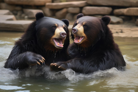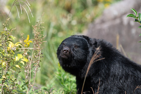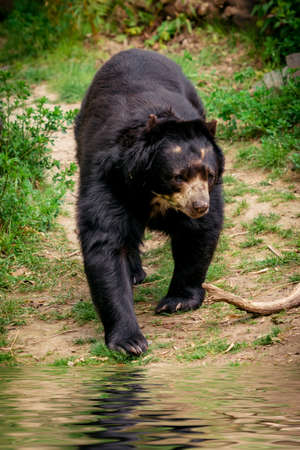 Asiatic black bear, Tibetan black bear, Ursus thibetanus, large tropical asian bear with black fur and white V shape fur on the bust
