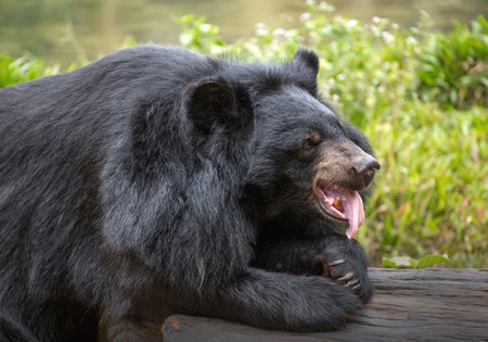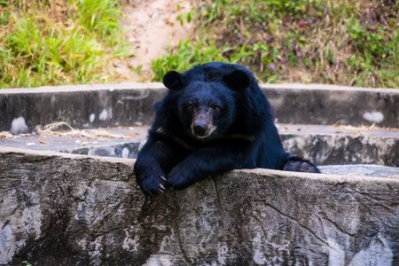 An adult Formosa Black Bear lying down on the rock in the forest at a day hot summer. Ursus Thibetanus Formosanus.