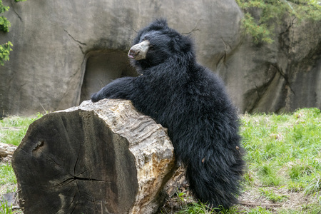 closeup large black bear stands on paws on grass at tree trunk in zoo of tropical park in Asia