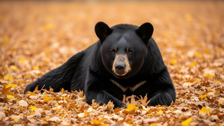 A large black bear lies restfully on a forest floor covered in vibrant orange and brown autumn leaves. The animal gazes directly at the camera, contrasting its dark fur against the colorful fall foliage.