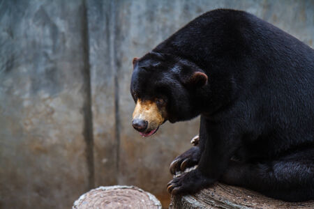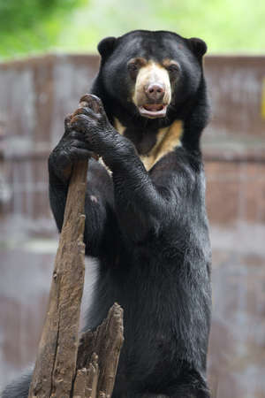 Helarctos malayanus waiting for its food in the zoo / Malayan sun bear standing and relax in the summer