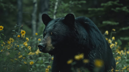 Black bear stands confidently near water's edge, surrounded by lush greenery, capturing the essence of wilderness and nature's grace.